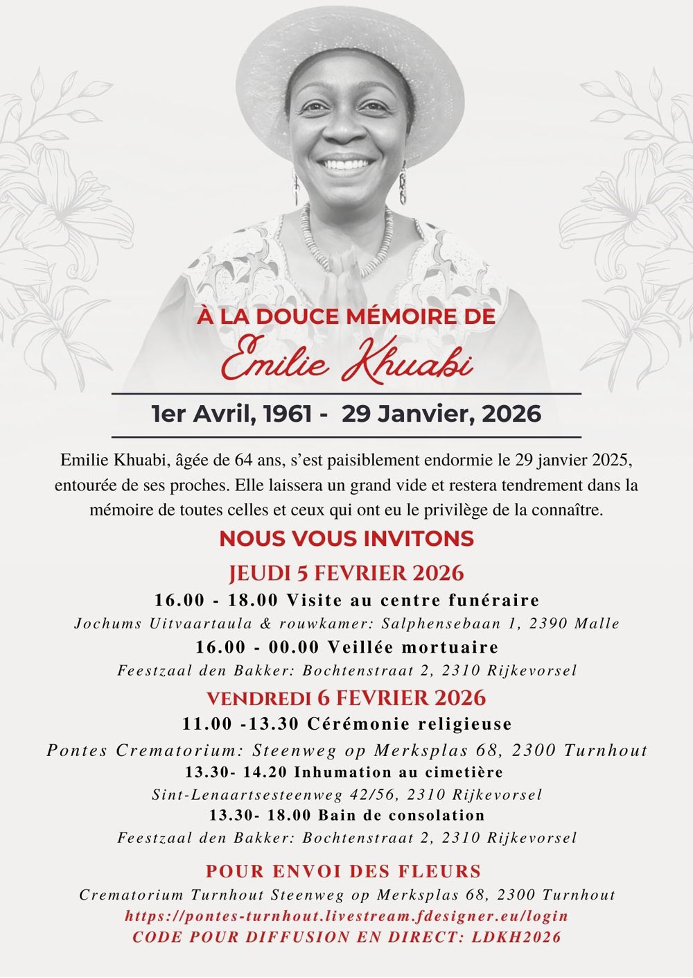 Emily was known and appreciated all of us, who will remember her warmth, kindness, and presence with great affection. We extend our heartfelt condolences to Dr Vermeiren, his family, and his loved ones. Our thoughts are with them during this time of profound loss.